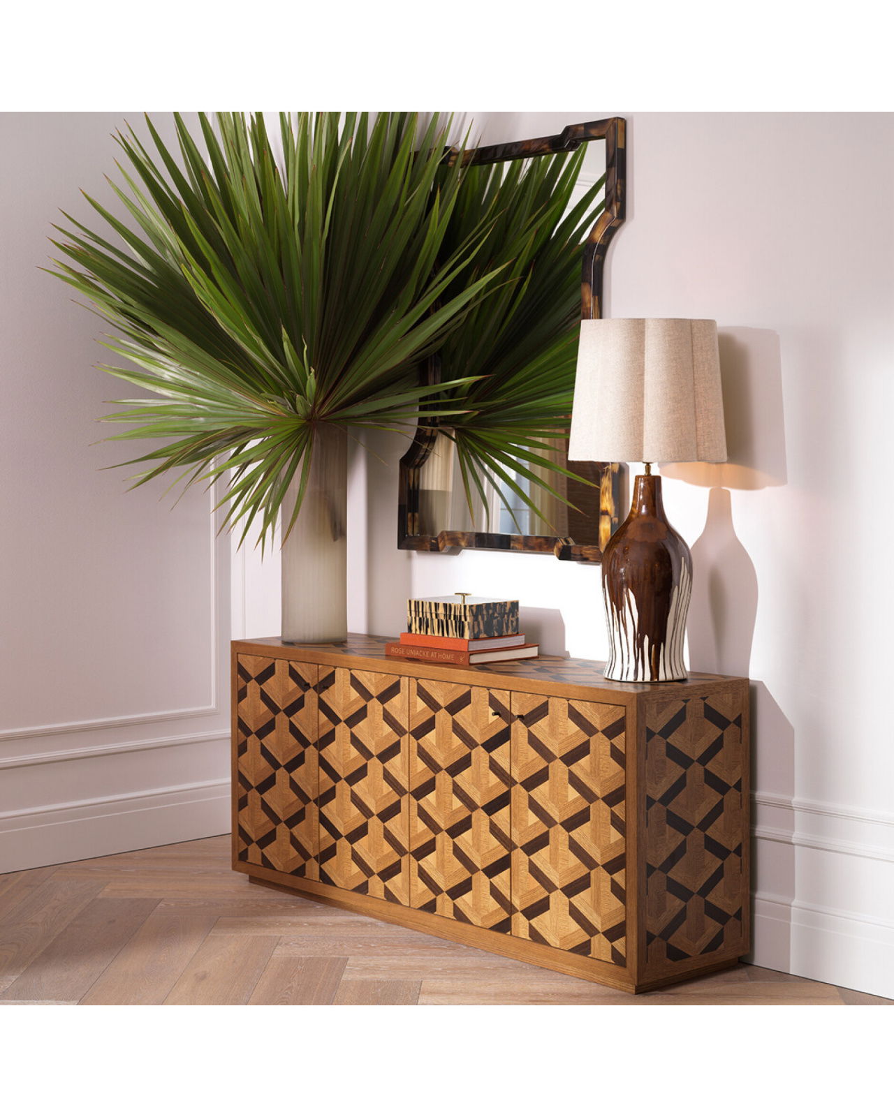 Rubicon on elegantti lipasto, jossa on tammiviilu ja selkeä intarsia-kuvio, joka antaa huonekalulle ylellisen ja graafisen ilmeen.